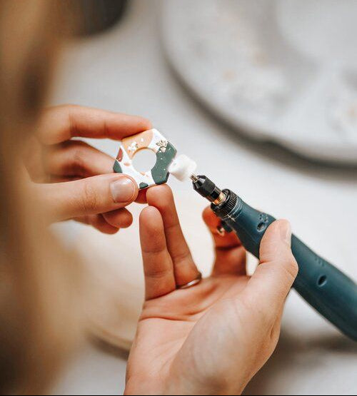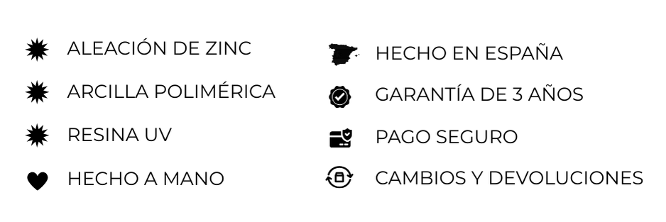 El aro hexagonal está realizado en arcilla polimérica sellada con resina UV, un acabado resistente y duradero, pero el contacto frecuente con agua —especialmente agua salada o con cloro— puede afectar con el tiempo al brillo y a la superficie protectora.